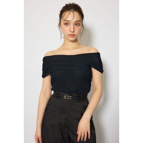 【チュールのクロスデザインがポイントのカットトップス】■ポイントストレッチ性のあるメッシュチュールとカットソーを合わせたデザイン性の高いカットソーに仕上げました。肩のチェーンは外さずストラップとしてそのまま着用してください。お洗濯の時に取り外し可能。■ディテールチュールのフロントクロスデザインがバストを華やかに魅せてくれ、デコルテを見せて女性らしく着用できるのが嬉しいポイントです。華奢なチェーンでこの時期にお勧めしたい1着です。■スタイリングパンツスタイルにINコーデが格好良く決まり、ミニボトムスやデニムに合わせるのも華やかに決まります。■生地透け感:身頃は透けない。チュールの部分のみ。裏 地:なし伸縮性:あり光沢感:なし厚 さ:なし■商品のお気に入り登録お気に入りアイテムの再入荷・在庫1点などの通知を受け取ることができます。[注意事項]※画像の商品はサンプルです。実際の商品と仕様、加工が若干異なる場合があります。※画像の商品は光の照射や角度、お使いのモニター環境により、実物と色味が異なる場合がございます。※着用、お取り扱いの際は、アテンションタグをご確認ください。