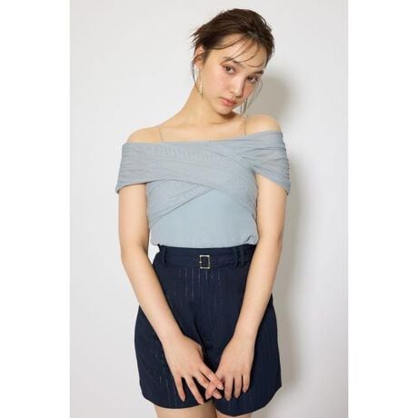 【チュールのクロスデザインがポイントのカットトップス】■ポイントストレッチ性のあるメッシュチュールとカットソーを合わせたデザイン性の高いカットソーに仕上げました。肩のチェーンは外さずストラップとしてそのまま着用してください。お洗濯の時に取り外し可能。■ディテールチュールのフロントクロスデザインがバストを華やかに魅せてくれ、デコルテを見せて女性らしく着用できるのが嬉しいポイントです。華奢なチェーンでこの時期にお勧めしたい1着です。■スタイリングパンツスタイルにINコーデが格好良く決まり、ミニボトムスやデニムに合わせるのも華やかに決まります。■生地透け感:身頃は透けない。チュールの部分のみ。裏 地:なし伸縮性:あり光沢感:なし厚 さ:なし■商品のお気に入り登録お気に入りアイテムの再入荷・在庫1点などの通知を受け取ることができます。[注意事項]※画像の商品はサンプルです。実際の商品と仕様、加工が若干異なる場合があります。※画像の商品は光の照射や角度、お使いのモニター環境により、実物と色味が異なる場合がございます。※着用、お取り扱いの際は、アテンションタグをご確認ください。
