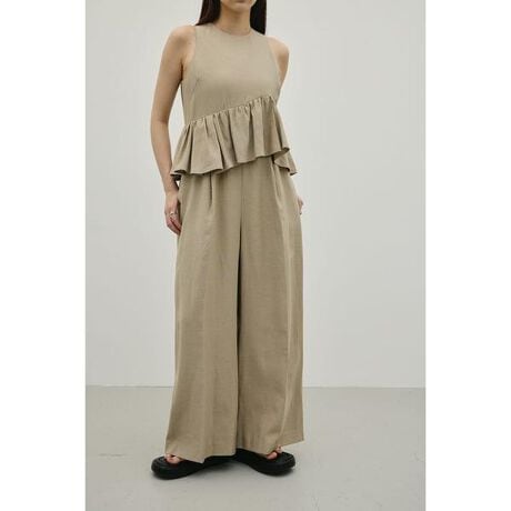 モデル身長163cm(Mサイズ着用)清涼感と程よいハリ感のあるリネン混素材を使用したフリルオールインワン。ウエストに施したランダムフリルが華やかな印象になり、シンプルながらも存在感のあるデザインに仕上げました。すっきりとしたノースリーブデザインにリラックス感のあるワイドシルエットパンツを組み合わせることで、程よいモード感と抜け感をプラス。便利なポケット付きで、デザイン性と実用性を兼ね備えた一枚です。ストレッチなし、透け感なし。【お手入れ方法】ドライクリーニング