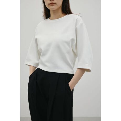 [型番:500JSA80-1991]モデル身長163cm(FREEサイズ着用)ハリ感のあるダンボールカット素材を使用したフォルムトップス。丸みをおびた立体感のある五分袖が、シンプルな中にモードさをプラスし、自然に二の腕もカバー。前はボックスシルエット、後ろはウエストにタックを施したフォルムと異なるシルエットで仕上げた一枚です。ストレッチあり、透け感なし。【お手入れ方法】マシンウォッシュ可
