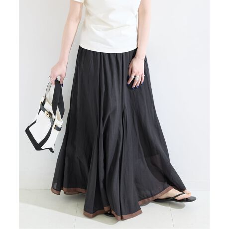 裾にマチを施しているのでたっぷりとしたボリューム感が出て、歩くたびにふわりと揺れ、女性らしい柔らかな表情をプラスしてくれます。裾にはさりげない微配色の細幅生地を叩きつけ、一枚でもレイヤードしているかのようなデザインに仕上げています。シンプルながらもディテールにこだわっていて、カジュアルからきれいめまで幅広いスタイリングに活躍します。