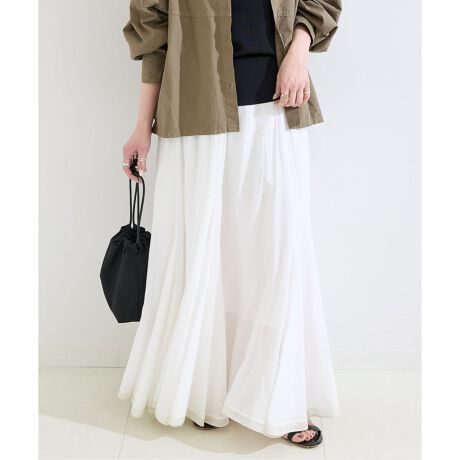 裾にマチを施しているのでたっぷりとしたボリューム感が出て、歩くたびにふわりと揺れ、女性らしい柔らかな表情をプラスしてくれます。裾にはさりげない微配色の細幅生地を叩きつけ、一枚でもレイヤードしているかのようなデザインに仕上げています。シンプルながらもディテールにこだわっていて、カジュアルからきれいめまで幅広いスタイリングに活躍します。