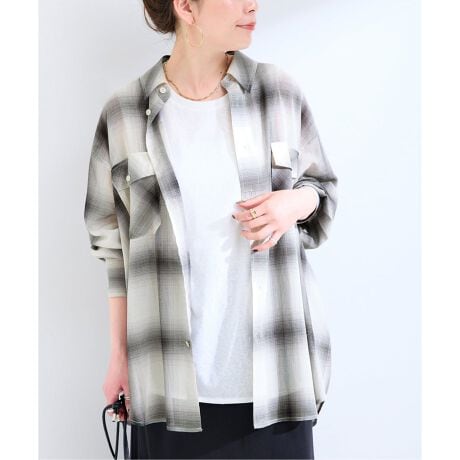 儚い色差のニュートラルな配色のオンブレチェック柄ですが、生地感も相まって大人っぽいルーズなフィット感でイン/アウト両軸で着用いただけます。シアー素材の軽やかな見た目で春らしいスタイリングになります。