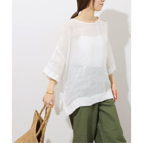 ◆清涼感があり、さらっとした着心地のリネンガーゼ素材を使用した半袖クルーネックブラウス