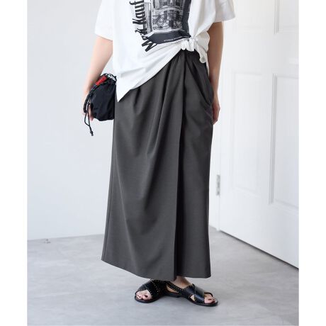 アシンメトリーなフロントデザインが目を引く、Iラインシルエットのロングスカート。