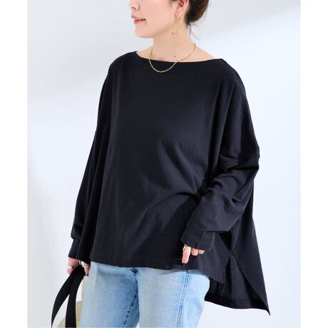 サイズ感:ボートネックでゆったりとしたサイズ感、前後差のある丈で腰回りをカバーするサイズです。