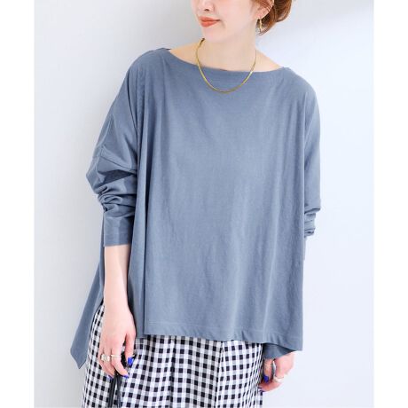 サイズ感:ボートネックでゆったりとしたサイズ感、前後差のある丈で腰回りをカバーするサイズです。