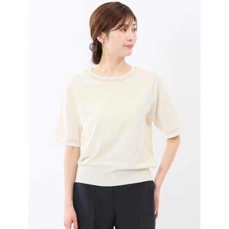 綺麗目からカジュアルまでオンオフ兼用で着回せる、半袖のニットプルオーバーです。衿ぐりと袖部分の涼しげなシアー切り替えがポイント。Tシャツのように着れる手軽さと上品なルックスを兼ね備えた一枚です。
