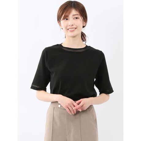 綺麗目からカジュアルまでオンオフ兼用で着回せる、半袖のニットプルオーバーです。衿ぐりと袖部分の涼しげなシアー切り替えがポイント。Tシャツのように着れる手軽さと上品なルックスを兼ね備えた一枚です。