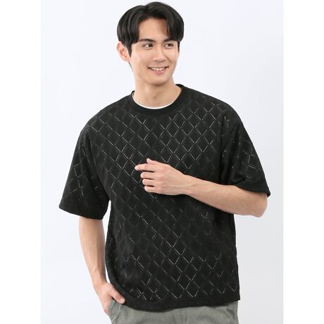 クルーネックの半袖プルオーバーはポリエステルにポリウレタンを混紡したシアー素材です。清涼感のあるサラッとした風合いと透け感のあるダイヤ柄が特徴。インナーの半袖Tシャツは白無地の天竺編みカットソーです。