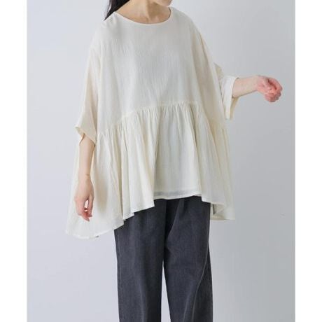 シンプルなボトムスに映えるブラウスが届きました。コットンクレープ生地は、表面に凹凸があり独特なシボ感が特徴です。程よくギャザーが入っていて、気になる部分を拾わないパターンにも注目。身幅がたっぷりとしているので着た時に両裾が自然に落ち、リラクシーで奥行きのあるシルエットです。簡単にスタイリングが完成する大人好みなアイテム。