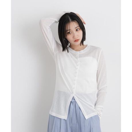 軽やかなシアー素材と繊細なリブが女性らしい雰囲気のカットトップス。シンプルなルックスに映える多ボタンディティールや、フロントの裾スリットでこなれ感をプラス。メインとしてもインナーとしても使えて、レイヤードスタイルにも重宝します。