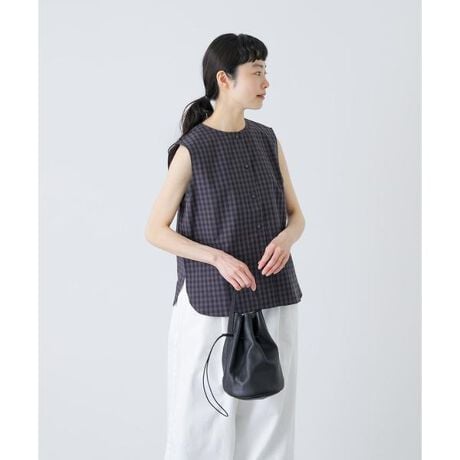 トーンが抑えられたギンガムチェックは、シンプルな装いに遊び心と存在感をもたらします。馴染みが良いので柄物ながらも着まわし力が高い一品。生地は近江晒加工を施し、ゆっくりもみほぐすことでふくらみや自然なシボ感が表現されています。ノースリーブの涼しいデザインですが、首まわりはコンパクトに仕上げているので上品な印象に。ボタンを開けてベスト感覚で取り入れるのもおすすめです。同素材のイージーパンツもぜひご覧ください。