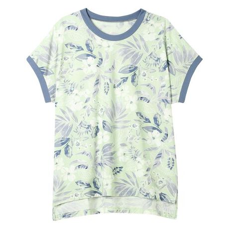 [型番:KTT123]・本体に、綿100%の強撚天竺素材を使用・接触冷感性があり、清涼感のある着ごこち・夏らしいボタニカル柄と特徴的なカラーリングがデザインポイント・ネックと袖口の切り替えカラーがデザインアクセントのトップス※お洗濯は、必ず「取扱い表示」にしたがってください。