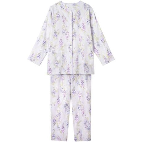 [型番:WDX547]・本体に、強撚糸を使用した綿100%のボイルピケ素材を使用・通気性がよくさらっと快適・藤の花( ウィステリア )と蔓をトレリスで表現し、やさしい雰囲気のあるプリント・襟まわりと前合わせ部分には、綿100%のローンパイピングをほどこし、上品なイメージに ※お洗濯は、必ず「取扱い表示」にしたがってください。