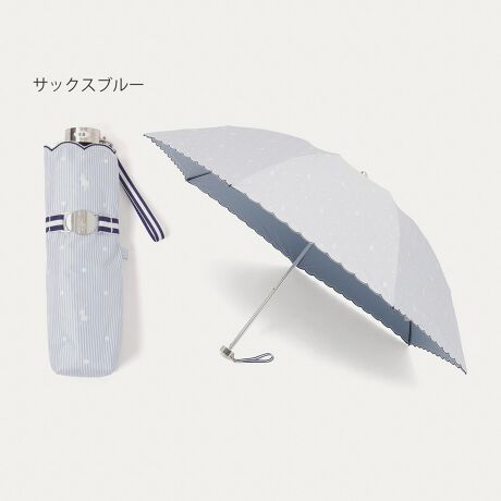 清涼感のあるピンストライプに、ドットとブランドシグネチャーをプリントした、繊細で愛らしい表情が魅力の折り畳み傘。