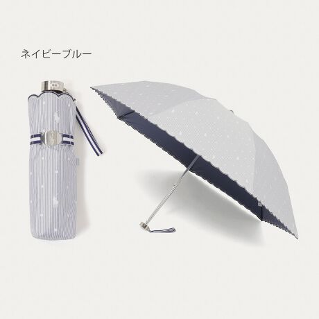 清涼感のあるピンストライプに、ドットとブランドシグネチャーをプリントした、繊細で愛らしい表情が魅力の折り畳み傘。