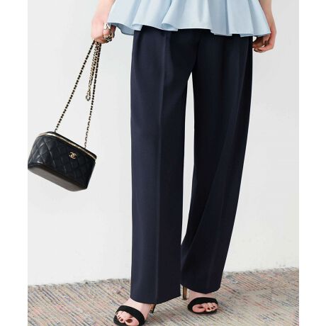 ウエストにゴムが入ったややハイウエストのタック入りパンツ。
