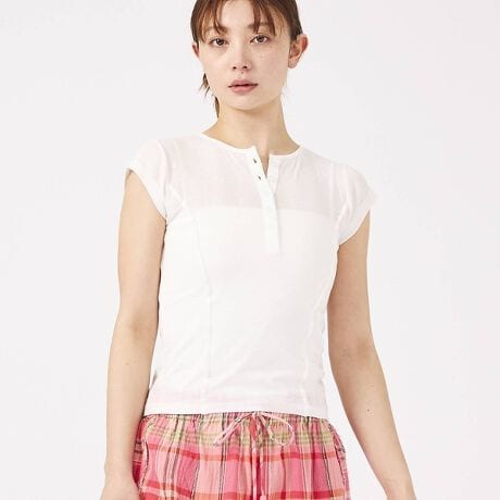 上品な透け感のあるライトパネルリブ素材を使用した半袖トップス。