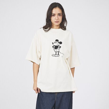 やわらかな風合いの生地に、存在感のあるミッキープリントをあしらったTシャツ。ゆったりとしたシルエットで、1枚で着てもこなれた印象に仕上がります。ベーシックなカラーに遊び心のあるデザインをプラスし、カジュアルながらも大人っぽく着こなせる一着。デニムやカーゴパンツ、スウェットなど、合わせるアイテムを選ばずデイリーコーデに活躍します。