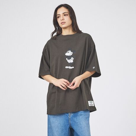 やわらかな風合いの生地に、存在感のあるミッキープリントをあしらったTシャツ。ゆったりとしたシルエットで、1枚で着てもこなれた印象に仕上がります。ベーシックなカラーに遊び心のあるデザインをプラスし、カジュアルながらも大人っぽく着こなせる一着。デニムやカーゴパンツ、スウェットなど、合わせるアイテムを選ばずデイリーコーデに活躍します。