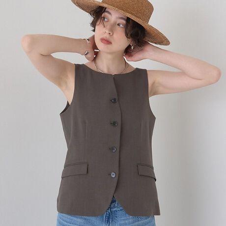 衿ぐりのラインがポイントになったジレです。フロントはボタン開きで、すっきりとしたノースリーブデザイン。フラップ付きのポケットがさりげないアクセントになり、ミニマルな中にも表情を添えています。同素材のスカート(31520370002)とセットアップで着用できるのも魅力です。