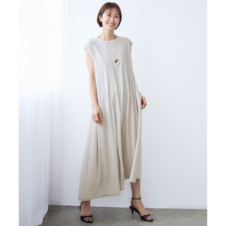 揺れるドレープが叶える大人の余裕ワンピース■デザイン豊かな広がりを持つタックと、アシンメトリーなシルエットが華やかなジャージワンピースです。落ち感のあるきれいめ素材を使用することで、イージーな着心地ながらも洗練された印象になっています。通勤から休日のお出かけまで、幅広いシーンで活躍します。■素材程よいストレッチ性と、細やかな凹凸感のある素材です。美しいドレープ性があり、上品で落ち着いた印象を演出します。さらに接触冷感機能に加えUVケア機能も備えており、暑くなる季節にも快適に着用いただけます。■同素材アイテムTブラウス(KKWMLM0431)パンツ(PRWMLM0431)フレンチスリーブカットソー(KKWMLM0432)