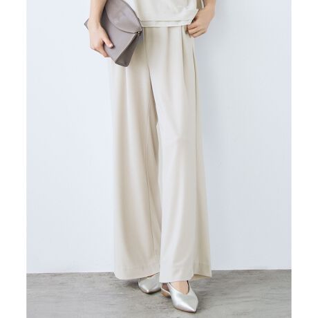 上品な落ち感で魅せるリラクシーなワイドパンツ■デザイン落ち感の美しい素材を活かした、ワイドシルエットのジャージパンツです。ウエストは総ゴム仕様でリラックス感のあるはき心地ながら、ドレープ性のある素材によりルーズに見えず、きれいめな印象に仕上げています。イージーさと上品さを両立し、オンオフ問わず着ていただけます。同素材のTブラウス(KKWRLM0431)やフレンチスリーブカットソー(KKWRLM0432)と合わせたセットアップスタイルもおすすめです。※ベージュ(033)のみ、ペチコートパンツが付きます。■素材程よいストレッチ性と、細やかな凹凸感のある素材です。美しいドレープ性があり、上品で落ち着いた印象を演出します。さらに接触冷感機能に加えUVケア機能も備えており、暑くなる季節にも快適に着用いただけます。■同素材アイテムTブラウス(KKWRLM0431)フレンチスリーブカットソー(KKWRLM0432)ワンピース(OPWRLM0431)