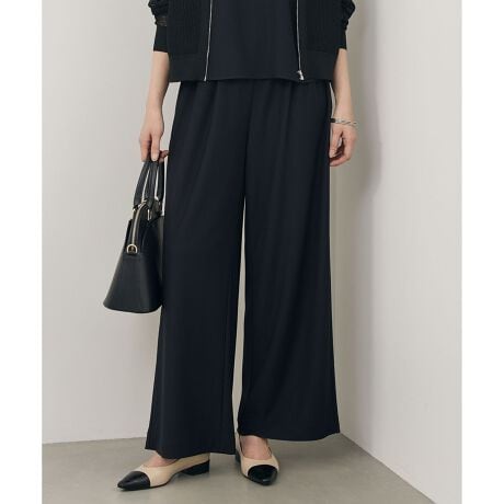 上品な落ち感で魅せるリラクシーなワイドパンツ■デザイン落ち感の美しい素材を活かした、ワイドシルエットのジャージパンツです。ウエストは総ゴム仕様でリラックス感のあるはき心地ながら、ドレープ性のある素材によりルーズに見えず、きれいめな印象に仕上げています。イージーさと上品さを両立し、オンオフ問わず着ていただけます。同素材のTブラウス(KKWRLM0431)やフレンチスリーブカットソー(KKWRLM0432)と合わせたセットアップスタイルもおすすめです。※ベージュ(033)のみ、ペチコートパンツが付きます。■素材程よいストレッチ性と、細やかな凹凸感のある素材です。美しいドレープ性があり、上品で落ち着いた印象を演出します。さらに接触冷感機能に加えUVケア機能も備えており、暑くなる季節にも快適に着用いただけます。■同素材アイテムTブラウス(KKWRLM0431)フレンチスリーブカットソー(KKWRLM0432)ワンピース(OPWRLM0431)