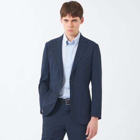 シングル2つボタン、腰パッチポケット、袖3つボタン仕様。背裏・袖裏を省いた一枚仕立てにより、非常に軽く快適な着心地です。コンパクトに収納できる為、持ち運びの利便性の良さで、ビジネスシーンはもちろんのこと、トラべルシーンにも活躍します。
