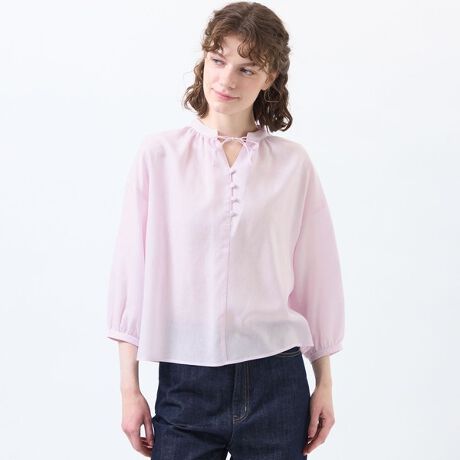 フロントに配したコロンとしたクルミ釦がポイントになったギャザープルオーバーブラウス。フロントのリボンは結んでも、ラフに垂らしたスタイルでも着用可能。たっぷりとした分量感により、体から離れたシルエットで清涼感があり蒸し暑い季節にぴったりです。トレンド感のあるやや短丈のレングスです。