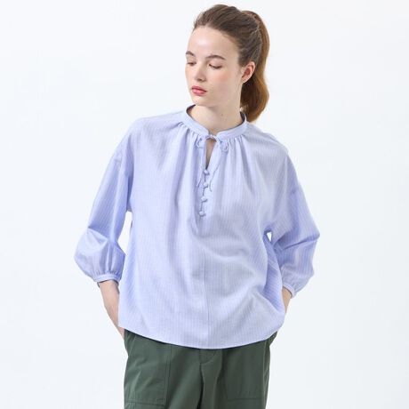 フロントに配したコロンとしたクルミ釦がポイントになったギャザープルオーバーブラウス。フロントのリボンは結んでも、ラフに垂らしたスタイルでも着用可能。たっぷりとした分量感により、体から離れたシルエットで清涼感があり蒸し暑い季節にぴったりです。トレンド感のあるやや短丈のレングスです。