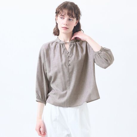 フロントに配したコロンとしたクルミ釦がポイントになったギャザープルオーバーブラウス。フロントのリボンは結んでも、ラフに垂らしたスタイルでも着用可能。たっぷりとした分量感により、体から離れたシルエットで清涼感があり蒸し暑い季節にぴったりです。トレンド感のあるやや短丈のレングスです。