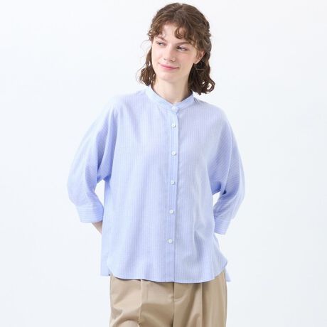 すっきりとした印象のバンドカラーのドルマンスリーブシャツ。ドルマンデザインは体のラインを拾いにくく、体系カバーしてくれるアイテム。また、体から離れたシルエットで、風通しも良く、湿度の高いこれからの季節に清涼感がある着心地です。七分丈の袖丈で、季節の変わり目の気温が不安定なシーズンにも羽織アイテムとして大活躍な一着。