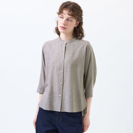 すっきりとした印象のバンドカラーのドルマンスリーブシャツ。ドルマンデザインは体のラインを拾いにくく、体系カバーしてくれるアイテム。また、体から離れたシルエットで、風通しも良く、湿度の高いこれからの季節に清涼感がある着心地です。七分丈の袖丈で、季節の変わり目の気温が不安定なシーズンにも羽織アイテムとして大活躍な一着。