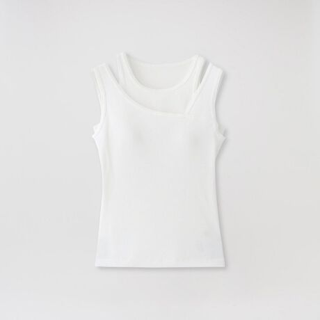 アシンメトリーなネックラインが目を引く、2枚をレイヤードしたようなデザインのタンクトップ。