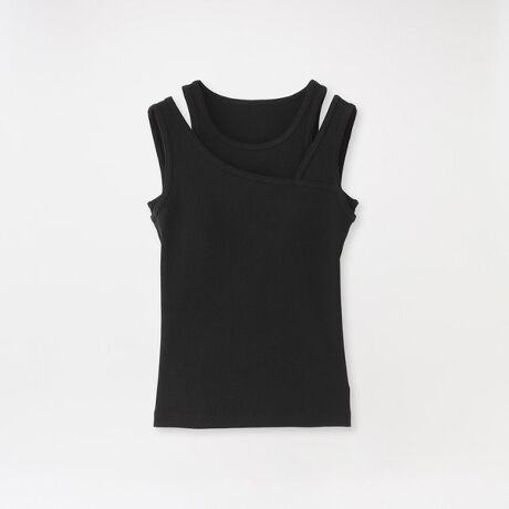 アシンメトリーなネックラインが目を引く、2枚をレイヤードしたようなデザインのタンクトップ。