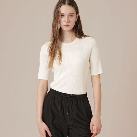 強撚のサラッとした肌さわりの半袖プルオーバーです。リブ組織ながら若干張り感のある素材で体のシルエットを拾いにくく、スタイリングしやすいアイテムです。同素材のカーディガン(品番:G5N72783)とアンサンブルで着用いただけます。