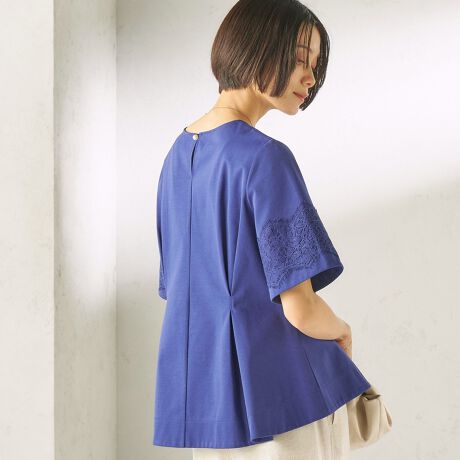 ウエストタックと袖のレース使いで立体感を出し、ブラウスのような上品な印象に仕上げています。