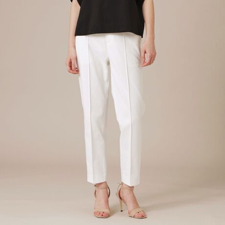 腰回りがスッキリとしたクロップド丈のテーパードパンツです。ひざ回りやふくらはぎが細過ぎず履き心地良く、クリーズラインのピンタックが細身に見えるシルエットです。リラックス感のあるトップスに合わせてもキレイ目なコーディネートに仕上がります。ウエスト後ろはゴム仕様、裏地なしです。