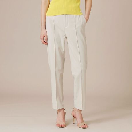 腰回りがスッキリとしたクロップド丈のテーパードパンツです。ひざ回りやふくらはぎが細過ぎず履き心地良く、クリーズラインのピンタックが細身に見えるシルエットです。リラックス感のあるトップスに合わせてもキレイ目なコーディネートに仕上がります。ウエスト後ろはゴム仕様、裏地なしです。
