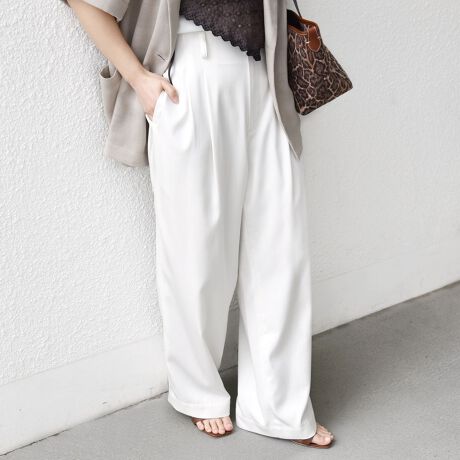 腰位置を高く見せる設計と2タック仕様で、お腹まわりをカバーしながらスタイルアップが叶うタックワイドパンツ。