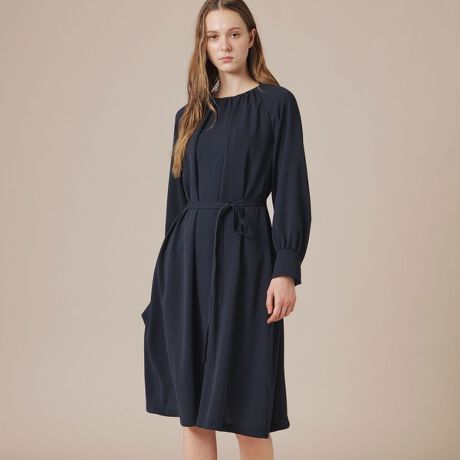 衿ぐりのギャザーが裾に向けて優雅に広がり、リラックスしたムードのワンピースです。程よく身体から離れたシルエットと袖のボリュームがエレガントな印象です。スッキリとした衿元はネックレスも映えます。アンダードレス付きです。
