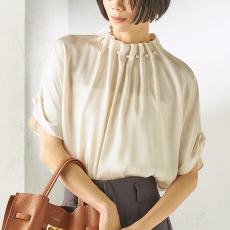 《予約》〈手洗い可能〉パール モチーフ ネック ギャザー ドルマン ブラウス