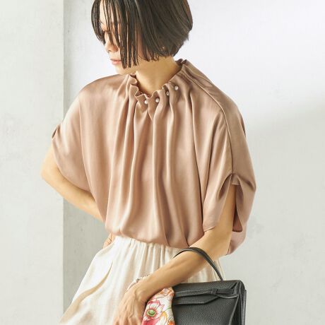 《予約》〈手洗い可能〉パール モチーフ ネック ギャザー ドルマン ブラウス