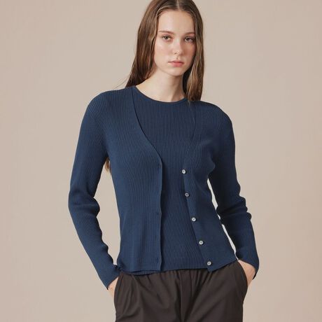 強撚でサラッとした肌さわりのカーディガンです。衿から前立てまで編み続きでエレガントなV開きに仕立て、リブ組織ながら若干張り感のある素材で体のシルエットを拾いにくく、スタイリングしやすいアイテムです。同素材のプルオーバー(品番:G5N73783)とアンサンブルで着用いただけます。