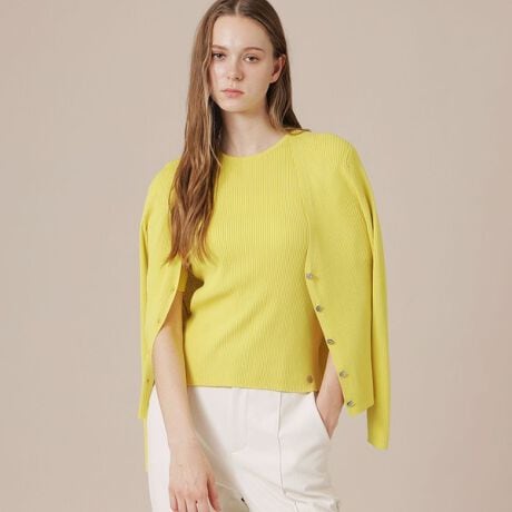 強撚でサラッとした肌さわりのカーディガンです。衿から前立てまで編み続きでエレガントなV開きに仕立て、リブ組織ながら若干張り感のある素材で体のシルエットを拾いにくく、スタイリングしやすいアイテムです。同素材のプルオーバー(品番:G5N73783)とアンサンブルで着用いただけます。
