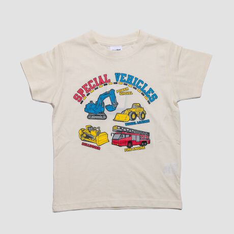 子どもたちに大人気!ポップな乗り物イラストが映える、乗り物好きな男の子にオススメな一枚です。素材には軽やかで肌なじみの良い薄手天竺を使用。通園・通学といった日常のあらゆるシーンで大活躍する、デイリー使いに最適なアイテムです。
