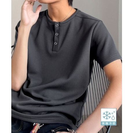 シンプルな佇まいに、切り替えと刺繍で遊び心をプラス。さりげない個性を添えた接触冷感機能付きのショート丈ヘンリーネックT。