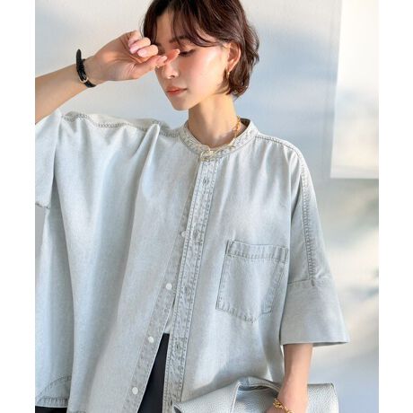 顔まわりをすっきり見せるバンドカラーに、肩を落としたスクエアシルエット。